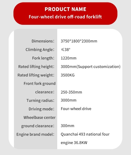 Το περονοφόρο ανεφοδιασμό τεσσάρων τροχών 3,5 τόνων είναι ένα είδος μηχανικού οχήματος με ισχυρή απόδοση εκτός δρόμου και χωρητικότητα φορτίου, η οποία είναι κατάλληλη για χειρισμό υλικών, στοίβαξη και χειρισμό σε διάφορες πολύπλοκες συνθήκες εργασίας και σκληρές συνθήκες εργασίας.